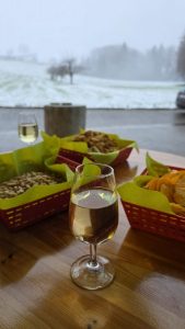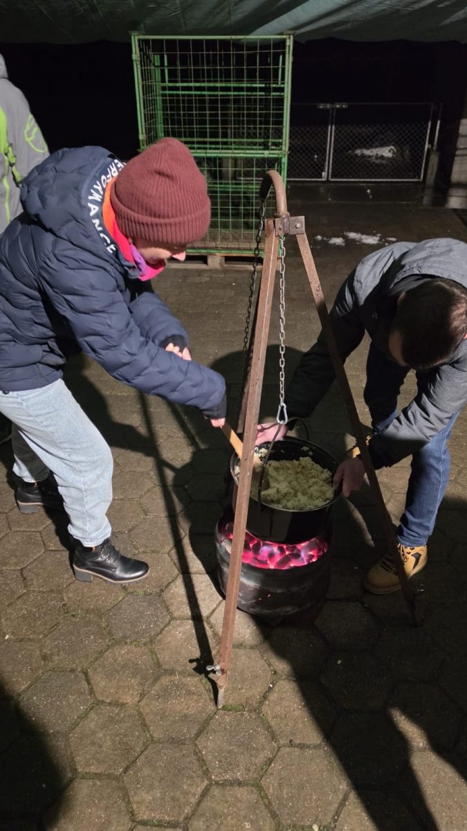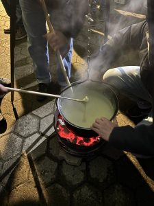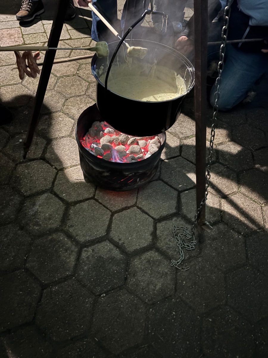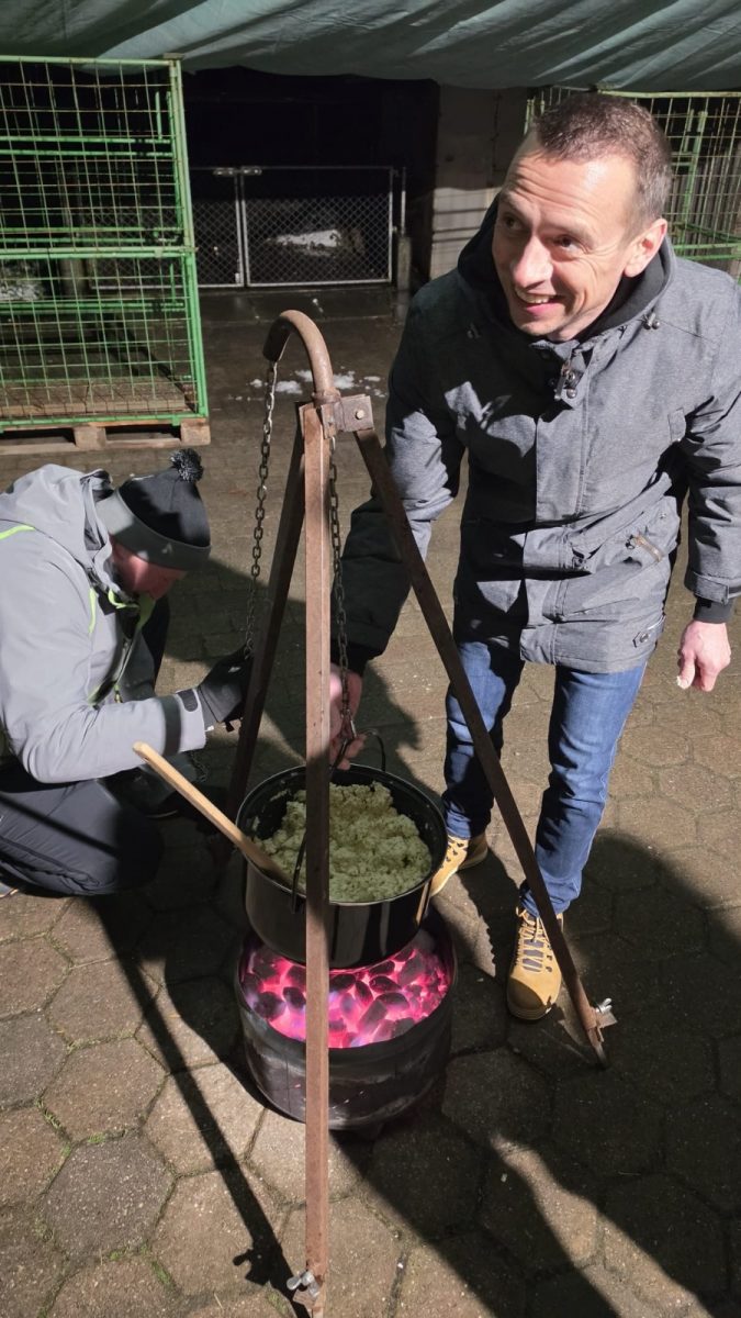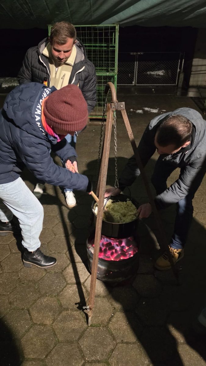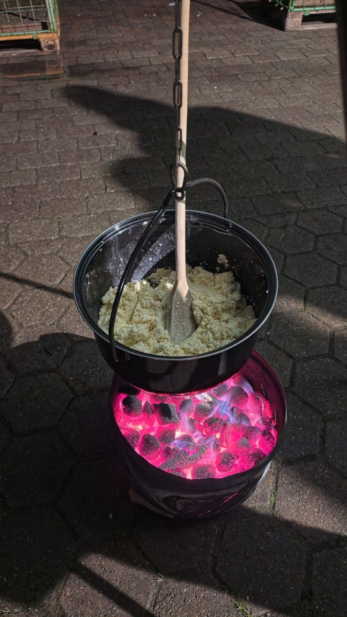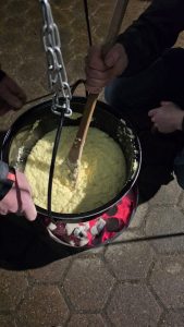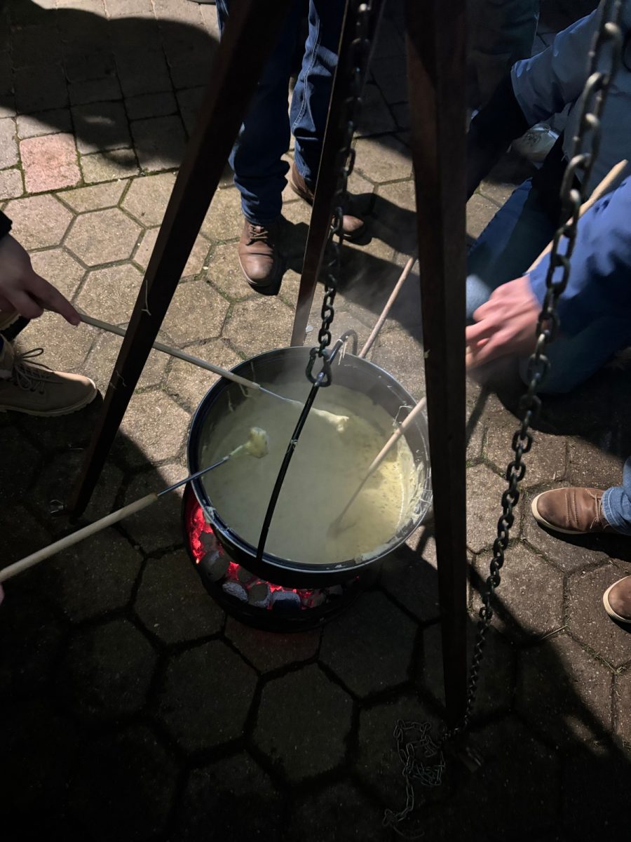 Die Familie Egli verwöhnte uns mit drei gefĂĽllten Fondue-Töpfen, die ĂĽber offenem Feuer im Freien zubereitet wurden (mit viel RĂĽhren 😊).